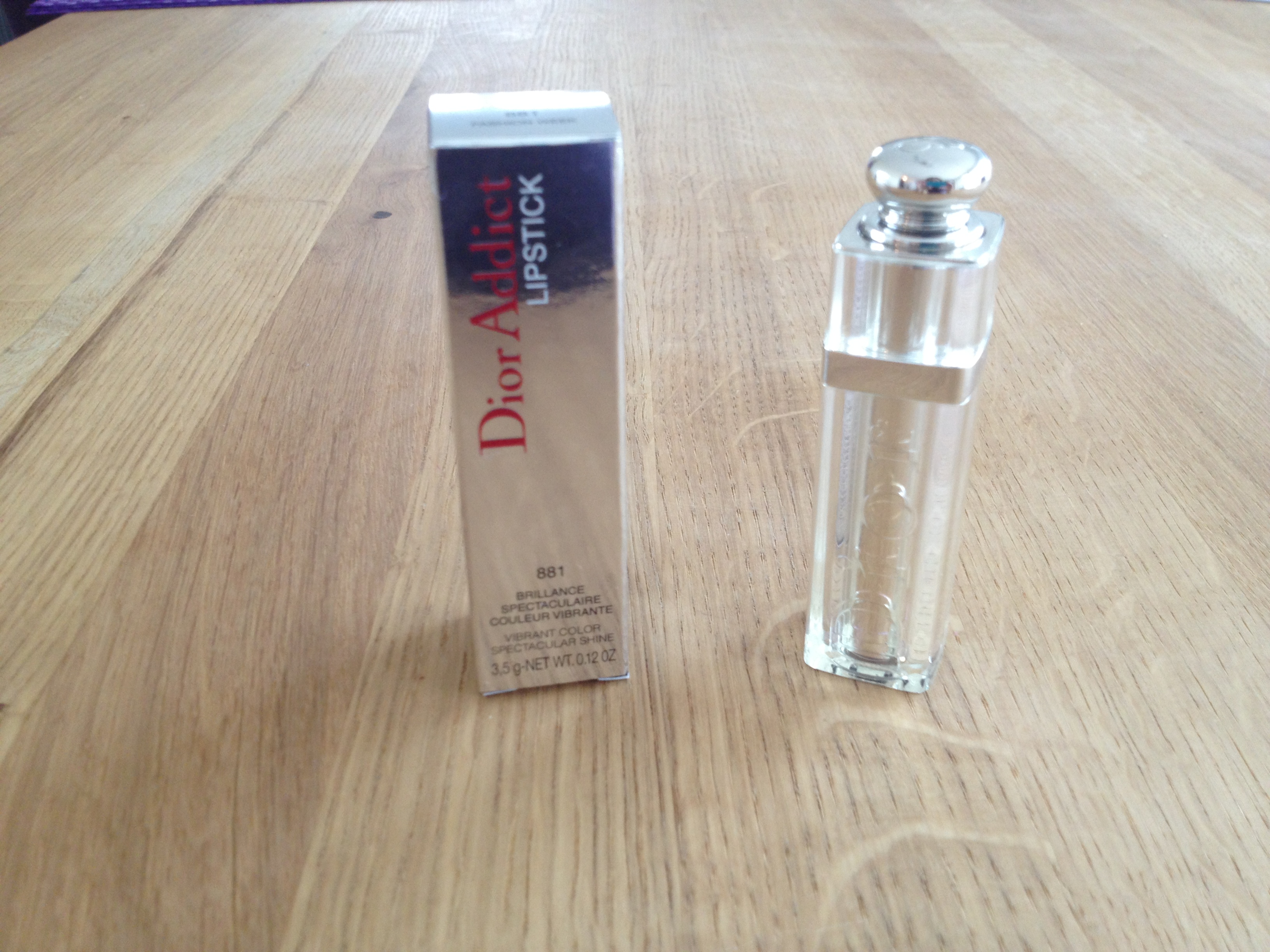 Cette fois-ci, il s’agit d’un rouge Dior Addict en couleur 881 Fashion Week 🙂 je précise que j’avais donné des instructions de couleurs (je voulais une rose-foncé ou un rouge tirant sur le bleu) à mon chéri mais qu’ensuite c’est lui qui a choisi la couleur et la marque 🙂